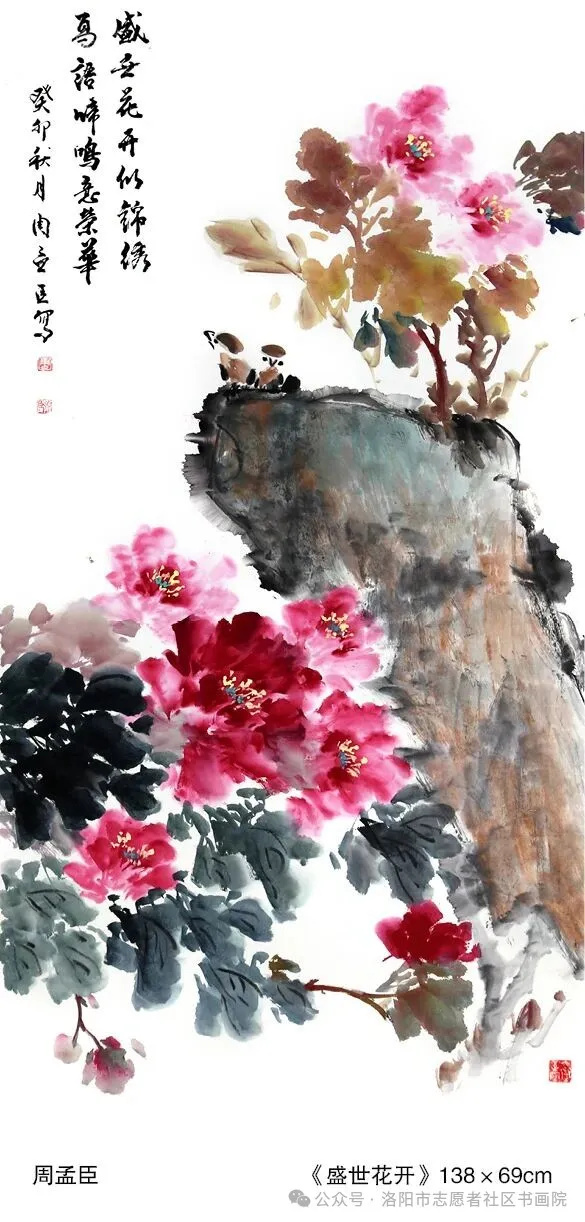 值此洛阳市志愿者社区书画院成立十周年之际,我们以笔墨为弦,以云端为台,奏响这场连续十期的书画交响,邀你共赴十年之约,细品岁月回甘。十年来,我们不断加强党的领导,把思想政治教育贯穿于文化志愿服务活动之中。坚持每年春季到社区、乡(镇)举办100场(次)公益书画培训;坚持每年重阳节进社区、乡(镇)为高龄老人送“福”献“寿",体现党的关怀;坚持每逢春节为群众义写义送春联。十年间,数千名手握笔墨的志愿者,下基层到社区,进企业入学校,传承中华文化精髓,让书画的馨香飘进寻常巷陌。使人民群众从宣纸上的一撇一捺,触摸中华文化的根;从画卷的一草一木,体会日常生活的暖;从志愿服务的一言一行,映射发自内心的光。十年无怨无悔的坚持,赢得了无数群众的赞扬,也得到了党中央的肯定。2022年被中宣部、中央文明办授予《全国优 秀志愿服务组织》。十期线上展览,犹如十卷连环画,一卷一世界:有篆隶的古拙藏着初心,有行草的洒脱写着热忱;有丹青绘就的祖国新貌,有翰墨记录的邻里温情。每一期都是一段故事的切片,每一幅都是一份心意的凝结。让我们坚信,当艺朮扎根基层,当爱心连成纽带,平凡的生活也能绽放诗意之花。这十期雅展,是给十年的情书,更是给未来的请柬。愿与您再赴下一个十年,让墨香更浓,让画卷更真!